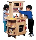 This compact Kitchen Center features 5 major appliances in one attractive play island. Complete with stove, oven, microwave, sink, and dishwasher with removable plate rack. Ergonomically kid-friendly counter-top provides food prep and dish washing area. Features turning knobs, silk-screened controls, acrylic windows on appliance doors, write-on wipe-off board, and wooden shelves for loads of storage. Assembly required. Materials: Hardwood, Hardboard, plastic. Dimensions (L/W/H): 32' x 23 1/2' x 44'. Weight: 87 lbs. For ages: 3-8 yrs.